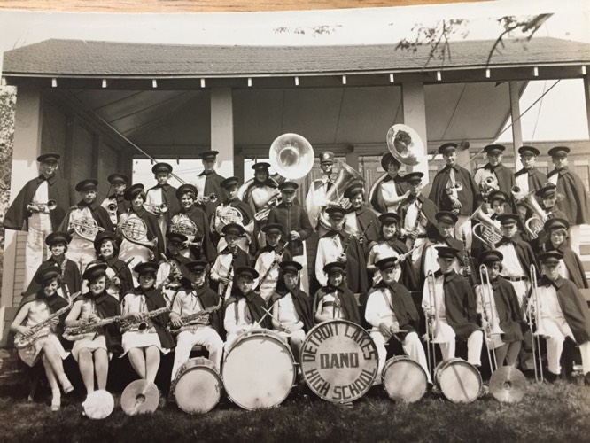 Forest Pfeifer in Detroit Lakes (MN) High School band. He is the tall clarinetist with glasses standing two back from the central drum.
