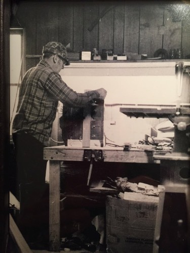 Forest W. Pfeifer, woodworking in his garage, date unknown