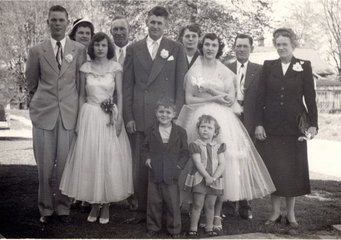 Adults from L to R: unidentified groomsman, Wanda (Rager) Murphy, unidentified bridesmaid, William F. Murphy Jr., Walter Rager Jr., Rowena Cauble, Wanda (Cauble) Rager, Clarence Cauble, Hazel Rager. Children are unidentified.